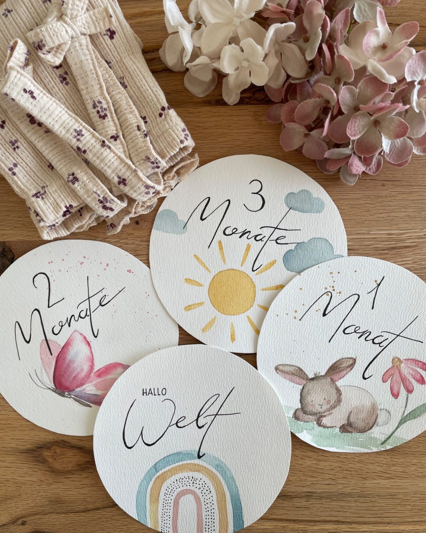 - Daraufhin dürft ihr 13 Meilensteinkarten aus hochwertigem Aquarellpapier für die werdene Mama bemalen.