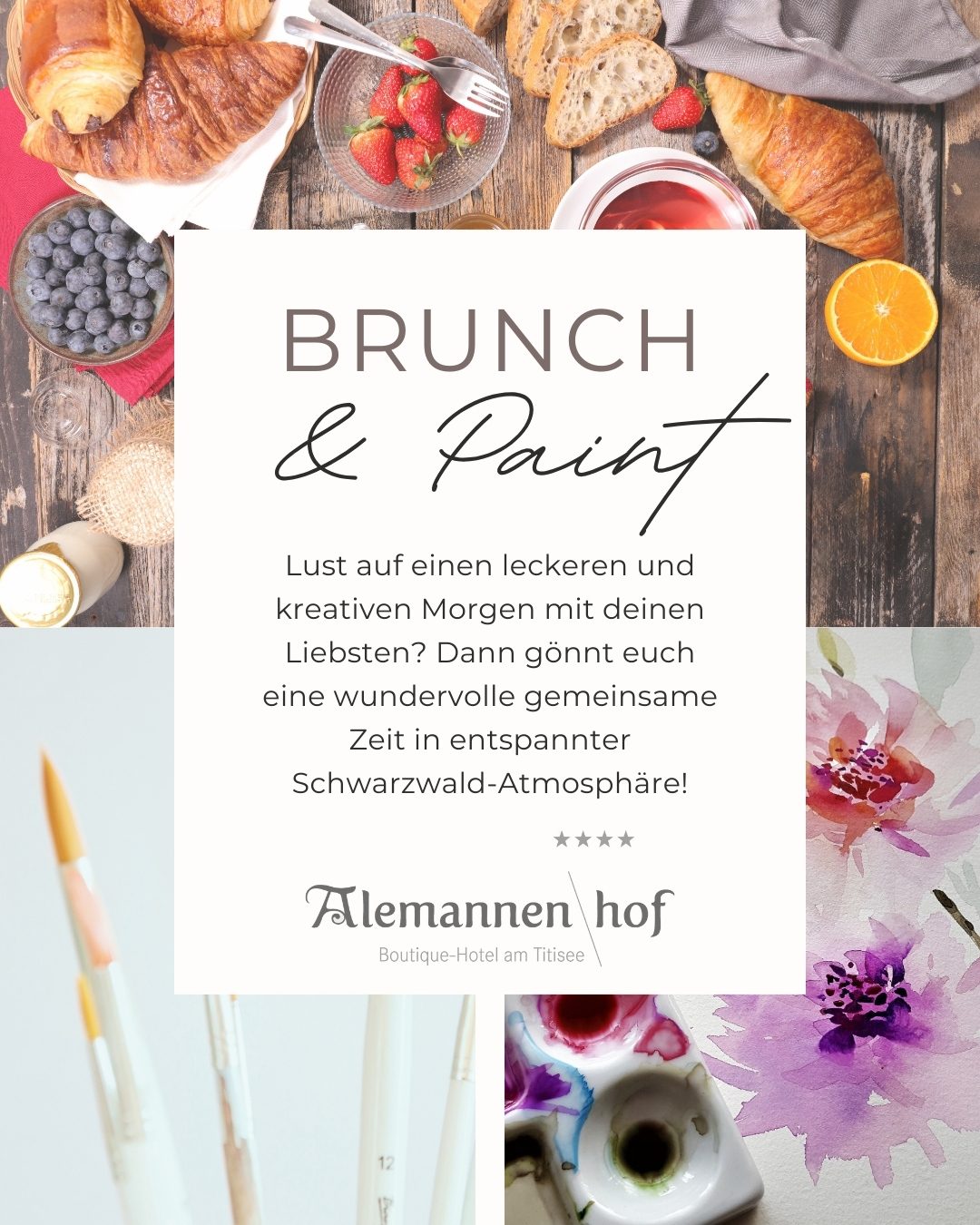 - 11:oo Uhr - Brunch: Genießt eine große Auswahl an regionalen, gesunden und leckeren Produkten. Getränke sowie 1 Glas Sekt inklusive.