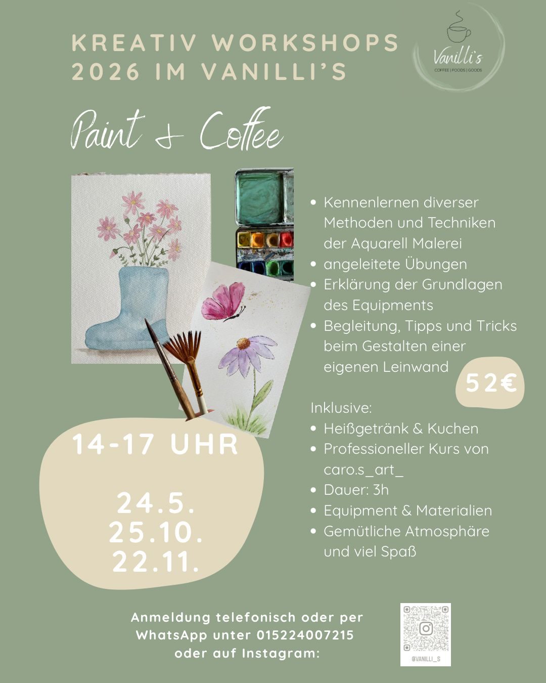 - 12:00 Uhr - Paint: Lernt die Grundlagen der Aquarellmalerei und gestaltet euer eigenes Kunstwerk unter Anleitung. Keine Vorkenntnisse notwendig. Malutensilien werden gestellt. Dauer: ca. 2,5 h